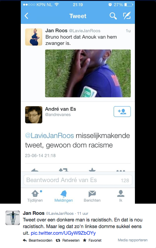 Een paar keer per jaar overkomt me dit: ik reageer op een tweet en er volgt een diarree van afkeurende reacties. Deze keer benoemde ik een tweet met daarin een foto van Bruno Martins Indi van Jan Roos als racistisch. Binnen een paar uur stond mijn TL vol met reacties hoe ik dat nu toch kan doen. Volgens de een had hij iedereen kunnen tweeten die zo keek, volgens een ander was ik wat uitleg verschuldigd en een hele reeks domme persoonlijke aanvallen met nog een lekker nabrander van Jan Roos zelf waarin ik zelf van racisme word beticht.