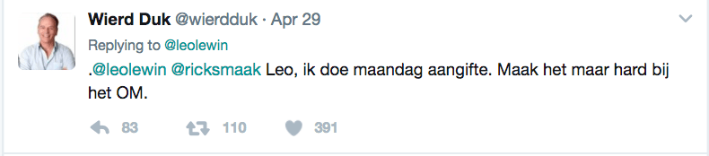 Ondertussen heeft Leo zijn excuses aangeboden, ik had van deze aardige en beleefde man niet anders verwacht. Als de heren Duk en Nijman een greintje fatsoen hebben bieden zij excuses aan voor de hetze die ze hebben veroorzaakt richting Leo. Allereerst omdat Duk zoals hierboven blijkt, zeker niet vrijuit gaat, ten tweede omdat overlast van de hordes extreem-rechts twitteraars die je achter je aankrijgt als Duk zielig gaat doen en Nijman er nog een Geenstijl blog tegenaan gooit buitenproportioneel is. Als Duk oprecht meent dat Leo het beschaafd heeft opgelost is het aan hem om ook beschaafd te zijn en een gebaar terug te maken.